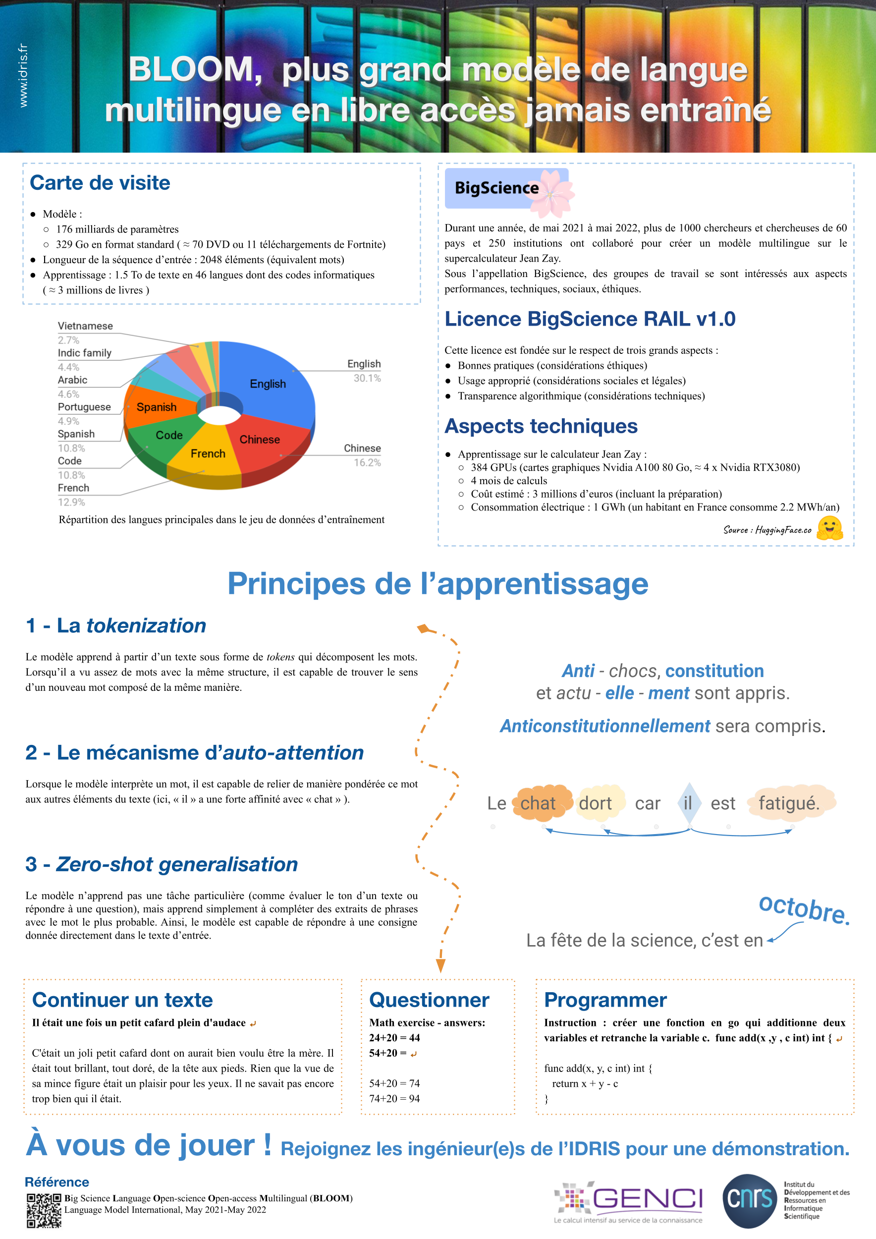 - Discuter avec BLOOM, un modèle capable de parler 46 langues et qui a nécessité trois mois et demi d’apprentissage sur Jean Zay, lors du projet BigScience en 2022.