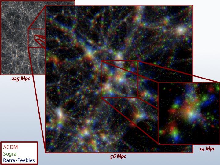 Cette image présente des cartes de la densité projetée de matière noire issues de la plus grande série de simulations au monde dédiée à l'étude de l'énergie noire. Deux aspects sont illustrés. Premièrement, l'aspect dynamique spatiale d?une simulation, avec ce zoom sur un halo parmi les centaines de milliers que contient chaque simulation. Deuxièmement, l'influence de l'énergie noire elle-même. En effet, chaque couleur correspond à un modèle d'énergie noire différent. On s'aperçoit ainsi que les différences entre les modèles d'énergie noire sont particulièrement marquées aux petites échelles (les 3 couleurs sont distinguables). Au total, 9 simulations comme celles présentées ici ont été réalisées. Elles ont nécessité 5 millions d'heures mono-cpu sur 4096 coeurs de calcul du supercalulateur Blue Gene de l'IDRIS dans le cadre d'un projet Grand Challenge obtenue par les membres du Projet Horizon au LUTH.