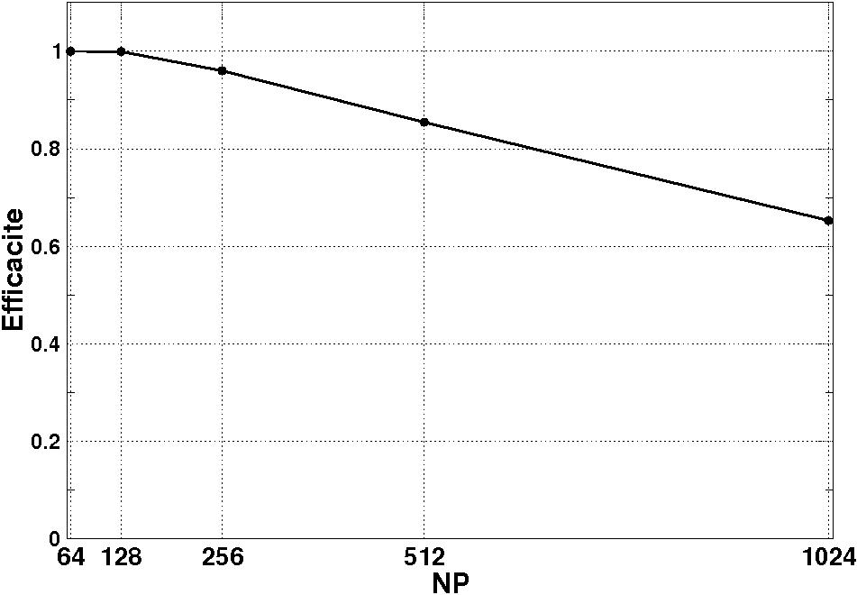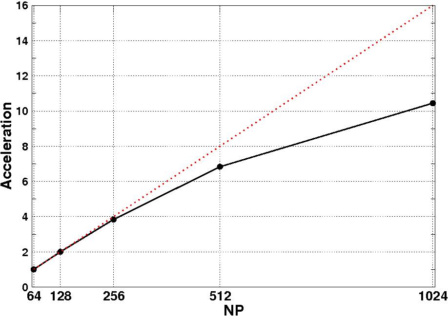 LHS plot: acceleration for different no. of processors NP, starting with NP=Nref=64 upto NP=1024; RH plot: efficiency versus no. of processors.