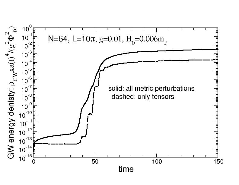 During the 2009 campaign, we have been working with a development account in Babel, where the time initially allocated has been used to perform some tests, change the program to render it more efficient, and perform the strong scaling test and the the extension curve in order to pass to production mode, which has been recently granted in October 2009. All the variables integrated present damped oscillatory behavior in time, with a typical average value for the frequency of order (1) in program units, and a damping factor given by the expansion rate H. The initial value of the latter, H0, is one of the problem parameters. We have performed a test of strong scaling type by running a small lattice with N=32 and; H0=0.003, integrating until tp=100. The reference value for the number of processors was NP=64. In Fig. 1 we have plotted the acceleration ersus the no. of processors (LHS), and the efficiency (RHS), defined as: Acc(NP)= tref/t(NP), Eff(NP)=Acc(NP)/(NP/Nref). With the time allocated left, we have run an example with N=64, L=10? and; H0=0.006. In Fig. 2 we show the results for the evolution of the energy density in GW, and their power spectrum versus comoving momentum at different times. We have compared the case when including all kind of metric perturbations with that usually studied in the literature where only the fluctuations of the field and tensors are kept. The aim now is to run lattices with N=128 and N=256, for different values of the lattice size L, and the damping parameter H0. By varying L and N we can check the sensitivity to both the infrared cutoff kmin=2?/L and the ultravioltet cutoff kmax= N (2?/L) of the lattice. For the physical problem at hand we need kmin < 0.4, and ?k no larger than 0.2, in order to check where the shift of the peak of the GW spectrum due to the effect of the scalar and vector metric perturbations.