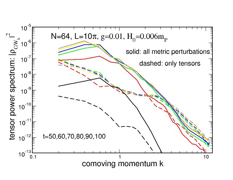 Figure 2: LHS plot: energy density for primordial GW produced after inflation, integrating the full set of Einstein equations (solid lines), and including only tensor perturbations (dashed lines). RHS plot: power spectrum for primordial gravity waves at different times. The system has been integrated in a lattice with N=64 sites per spatial dimension and size L=10?; g is the value of the coupling between the 2 scalar fields in hybrid inflation.
