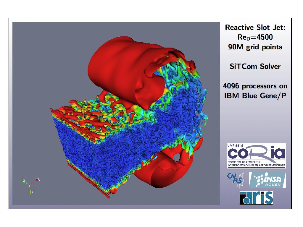 Ces simulations ont été utilisées lors du dernier Summer Program du CTR de Stanford en collaboration avec D. Veynante (EM2C Paris) afin de valider un modèle permettant de reconstruire la densité de flamme 3D à partir de la densité de flamme 2D telle qu'elle est connue par des mesures expérimentales. L'arrivée de Babel à l'IDRIS offre de nouvelles perspectives à la simulation numérique de la combustion turbulente et en 2009 l'introduction de cinétiques réalistes pourra être entreprise.