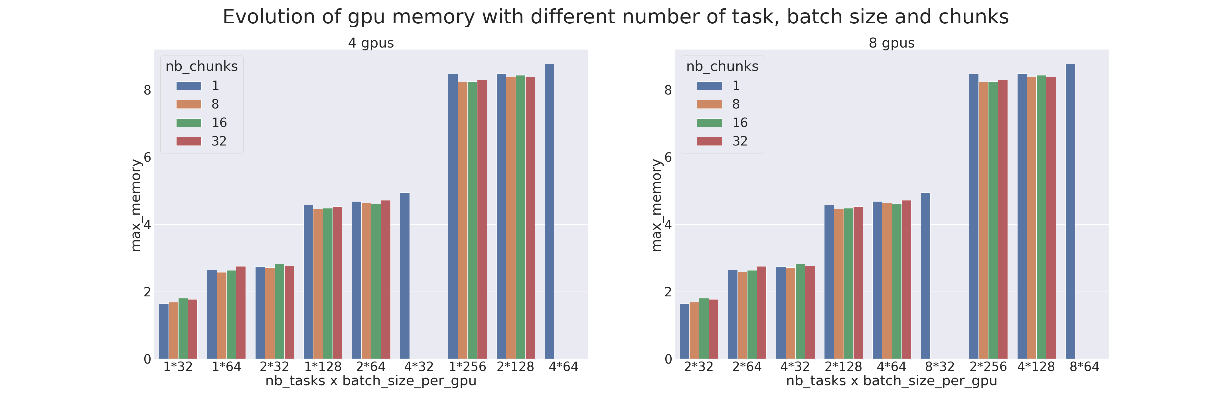 The model used is a transformer which is trained on the IMDB Review dataset with the goal of measuring the training performances (using a transformer for an uncomplicated task is not advised). Different batch sizes per GPU have also been tested, from 32 to 256, combined with different chunks, from 1 (naive model parallelism) to 32.