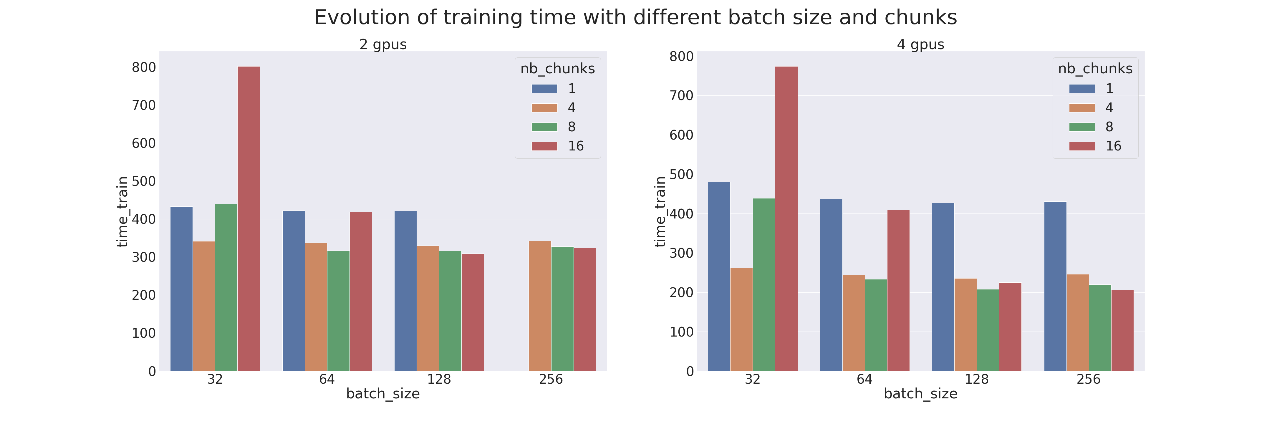 A benchmark was created to compare Pipeline Parallelism (with different parameters) with the naive model parallelism. Tests were carried out on 2 and 4 GPUs; therefore with a model cut into two or four parts. The model used is a transformer which is trained on the IMDB Review dataset (the goal is to measure the training performances; using a transformer for an uncomplicated task is not advised). Different batch sizes were also tested, from 32 to 256, combined with different chunks, from 1 (naive parallelism) to 16. The results are the following (when a sample is missing, it is because there was an OOM):