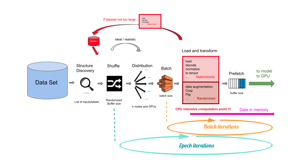 2/ L’étape de Structure Discovery permet de découvrir la structure de l’ensemble de données. Celui-ci n’est pas encore chargé en mémoire à ce stade. On récupère par exemple la liste des chemins vers les fichiers, ou plus généralement la liste des pointeurs de données associées à leurs étiquettes pour le calcul de la fonction de perte dans le cas d’un apprentissage supervisé.