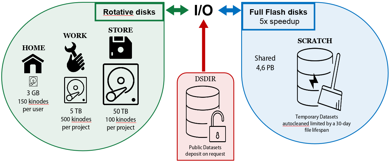| - Quotas de 5To et 500 kinodes par projet | + Quotas de sécurité très larges (4,6Po partagés par tous les utilisateurs) |