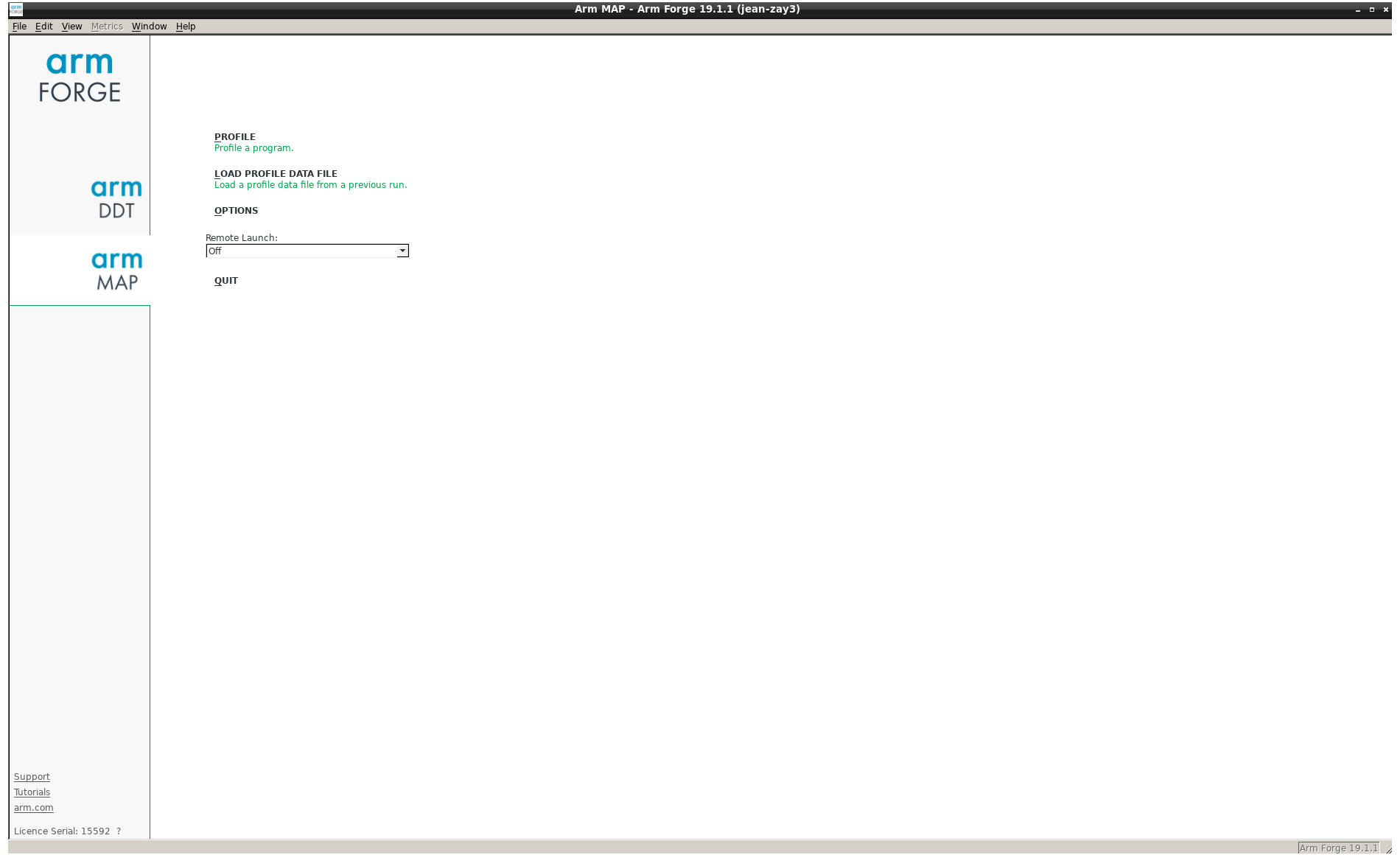 $ module load arm-forge $ map -v Arm MAP Part of Arm Forge. Copyright (c) 2002-2019 Arm Limited (or its affiliates). All rights reserved. Version: ...